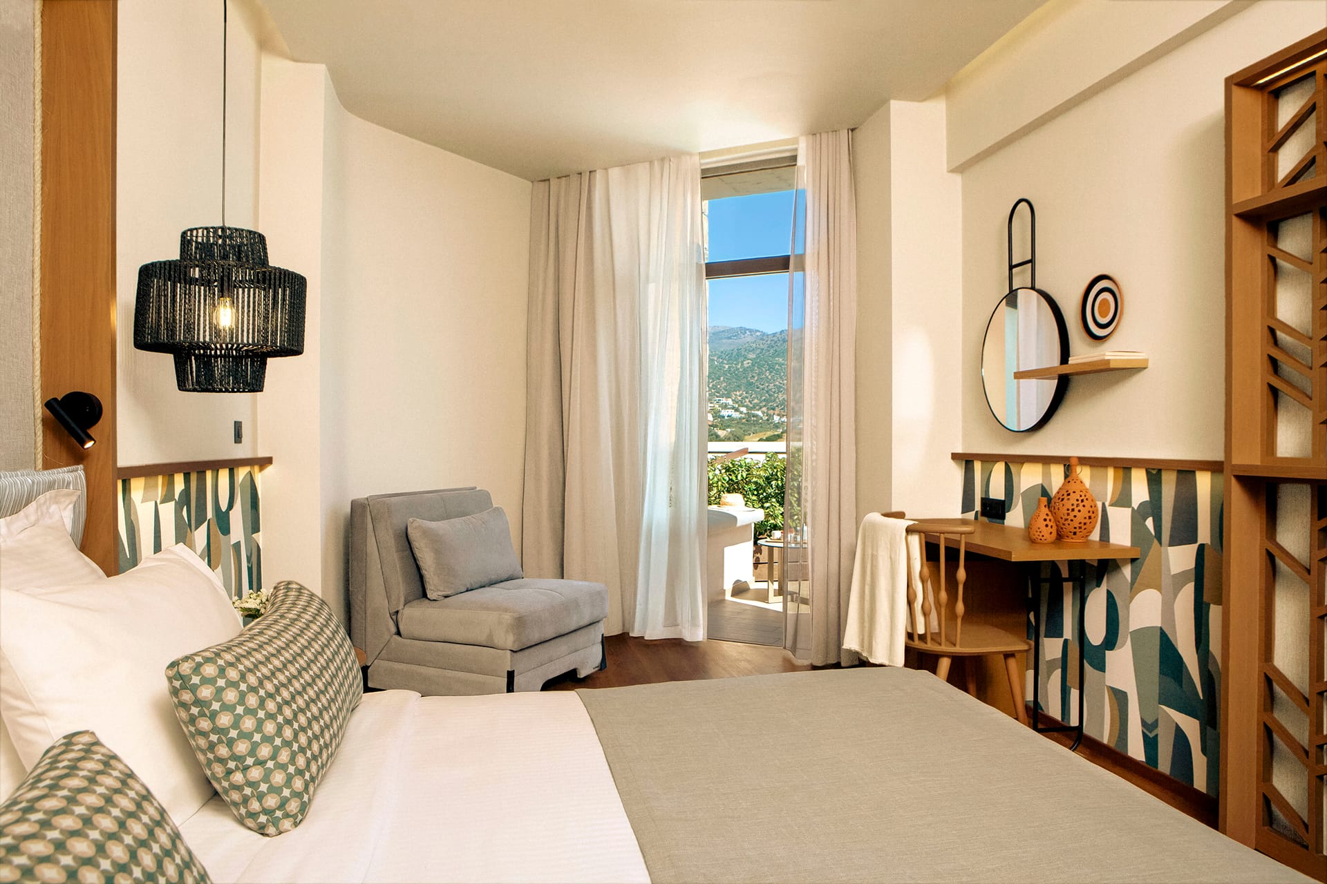 Our Deluxe Sea View rooms with Private Pool offer uninterrupted views of the Aegean sea and the quaint bay, providing our guests with a private balcony to relax and take in the salty breeze. The lighting is of low intensity, exuding a warm feeling hence creating an atmosphere of relaxation for its guests. The subtle