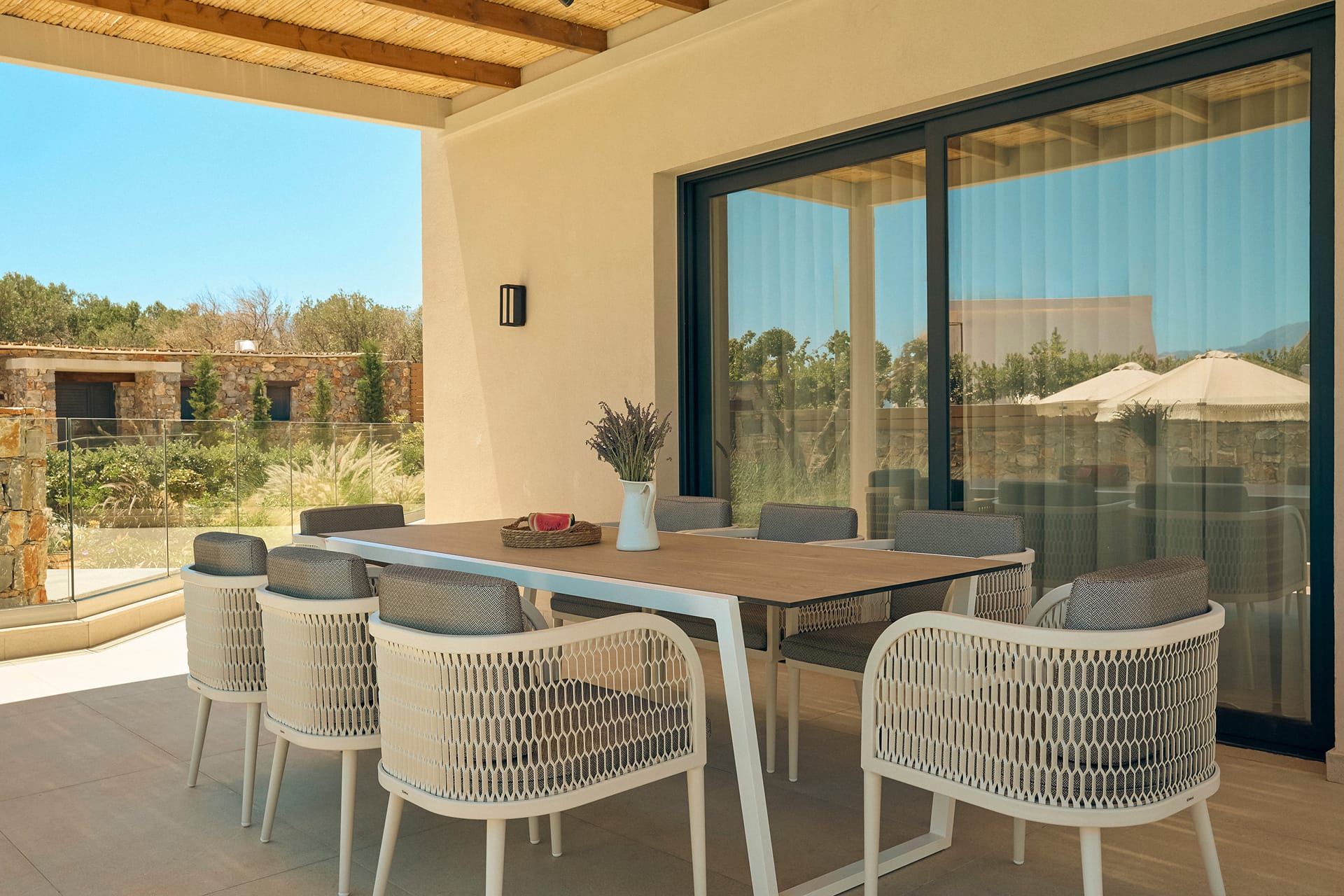 Experience unparalleled luxury and privacy at Villa Ntelina. This exceptional villa is designed to provide an unforgettable stay for up to 10 guests in ultimate comfort and style. Villa Ntelina offers 3 elegant bedrooms, each furnished with comfortable double beds and complemented by 3 luxurious master bathrooms, including a relaxing bathtub. The open-plan living area features a stylish living room with sofa beds, a charming dining area, and a fully equipped kitchen, making it the perfect space for socializing, dining, and entertaining.