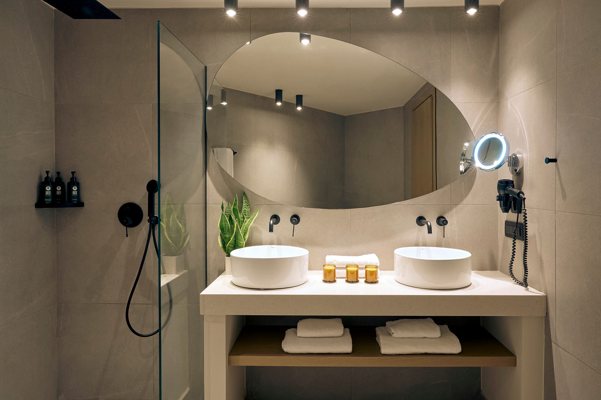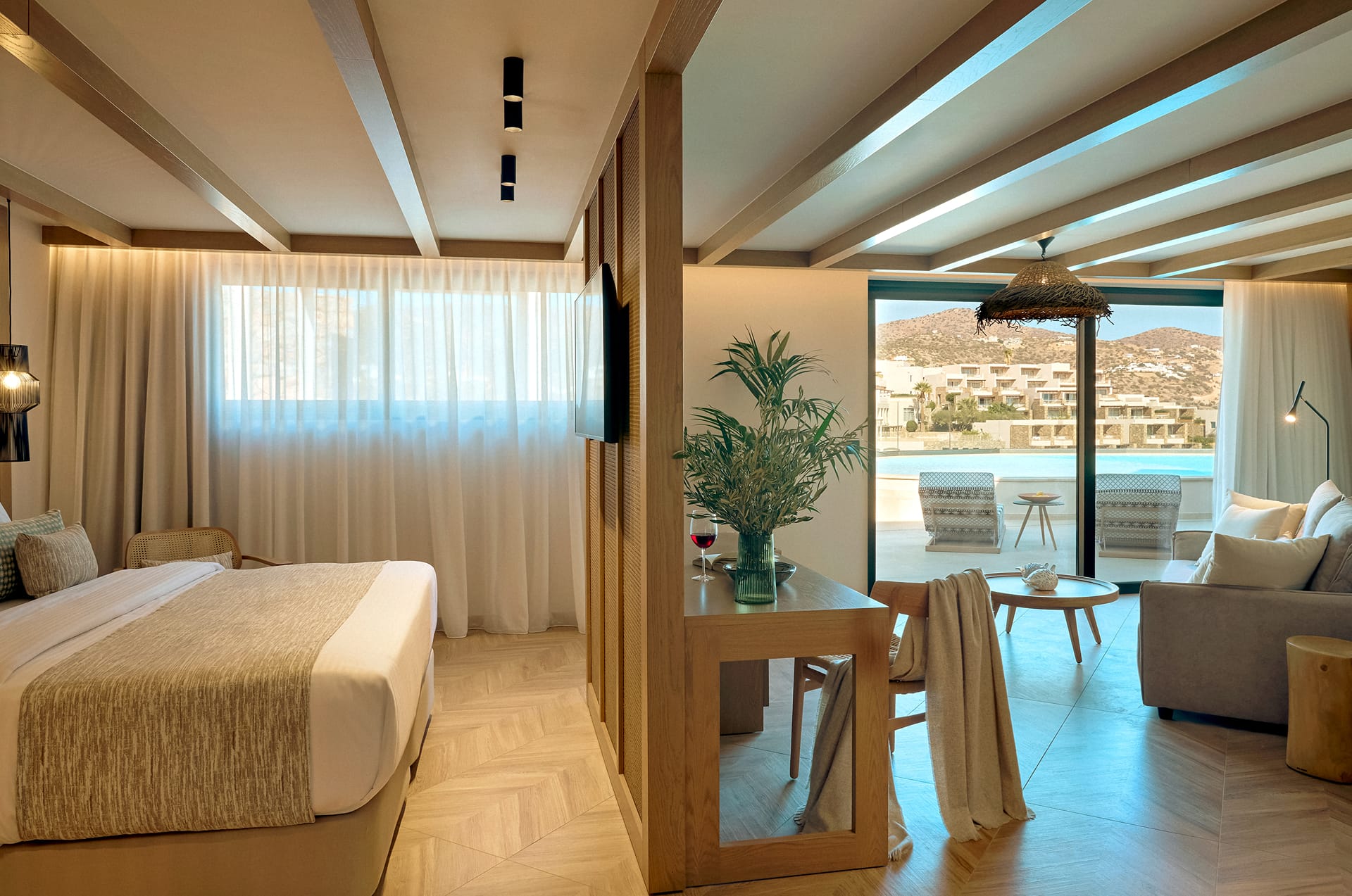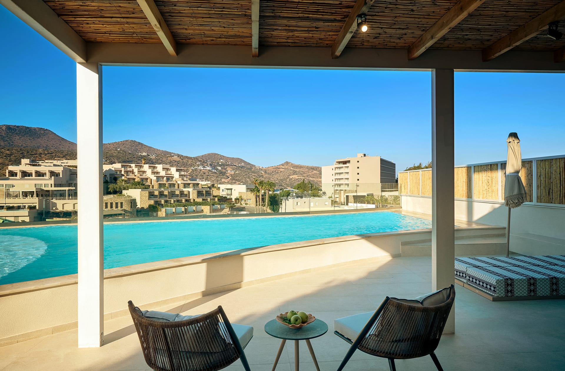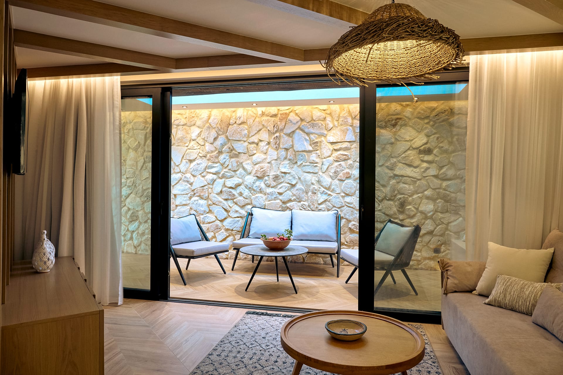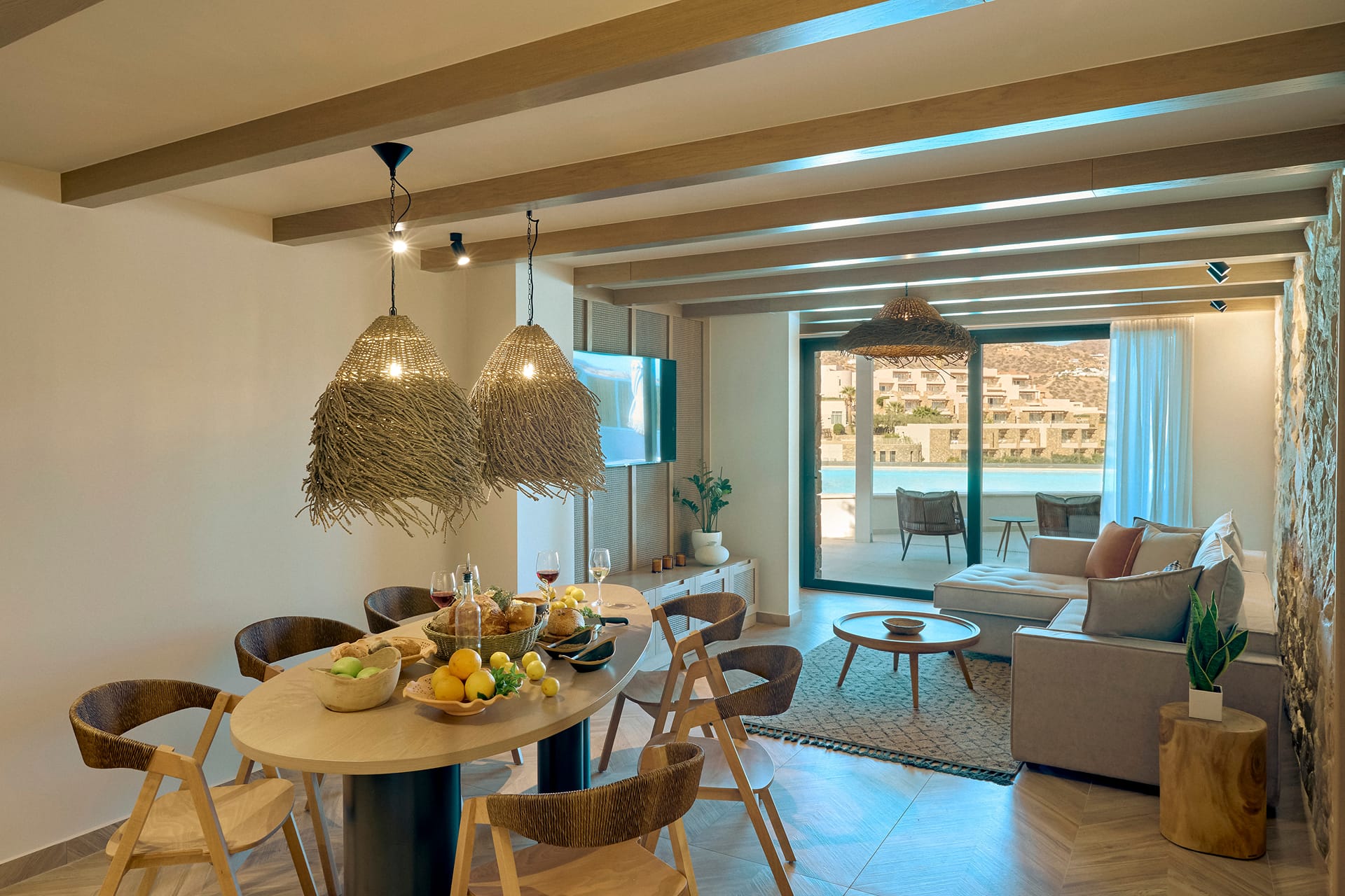 Villa Raeti offering unparalleled luxury and privacy in Mirabello Bay Luxury Resort. With its breathtaking panoramic sea view and world-class amenities, this spacious villa comfortably accommodates up to 10 guests, making it the perfect choice for families, friends, or groups seeking a serene, yet indulgent retreat. The villa features 2 elegant bedrooms, each furnished with double beds, and 4 stylish bathrooms, including 3 master bathrooms with luxurious bathtubs. For additional comfort, the villa boasts a spacious living room with 4 sofa beds, a chic dining area, and a dedicated cinema room, ideal for entertainment and relaxation.